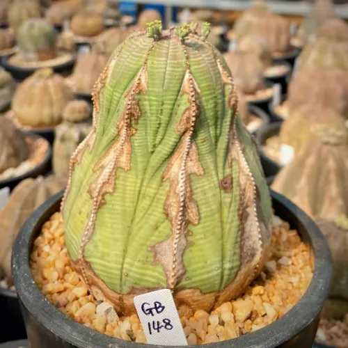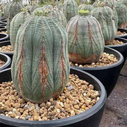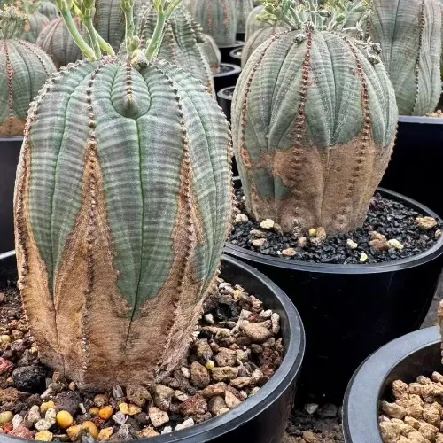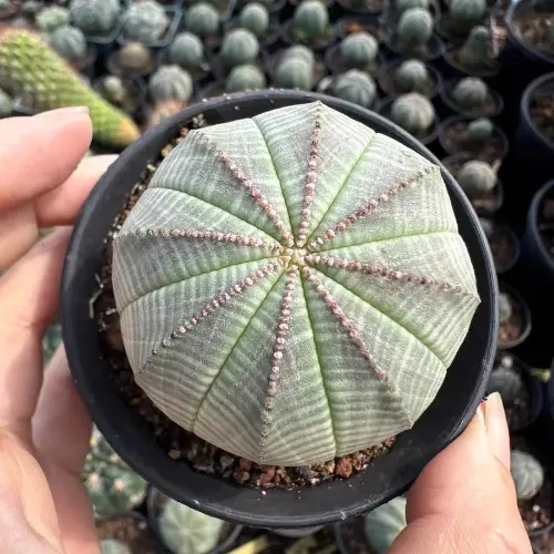 Euphorbia obesa thrives in warm, sunny environments with well-draining soil. Avoid excessive humidity or shade, as these can lead to brown spots on the stem and hinder growth. It is drought-tolerant due to its high succulence (lacking leaves and thorns) but sensitive to overwatering and frost. As a dioecious plant (separate male and female specimens), successful seed production requires careful pairing and pollination.
