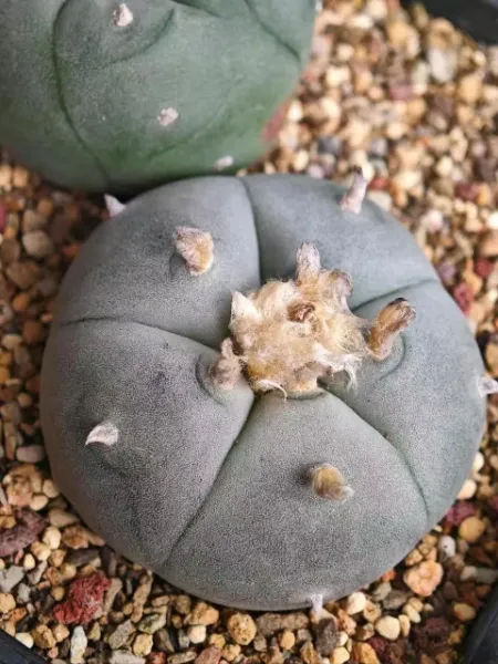 - Lophophora Diffusa (Silver Crown Cactus) Seedlings: Covered in a thin layer of white powder, like a dusting of fine powdered sugar. A hazy white sheen is clearly visible when viewed from the side. Gently rub with your fingertip, and the powder will fall off, revealing the pale green skin underneath. The area where powder falls won’t regrow it quickly, leaving a noticeable mark.